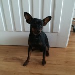 Czarno-brązowy, sierść krótka, średni wzrost, łapy przednie brązowe, pyszczek jasno brązowy, uszy oklapnięte, ma na sobie czarne szelki. Nazywa się Teddy.