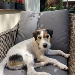 Kora ma aktualnie dłuższą sierść, jest z grubszym psem, sierść brązowa z białymi plamkami, pies nie widzi dobrze i ma problemu ze słuchem