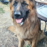 owczarek o ciemnej masce,na jezyku duza czarna plama , czerwona obroza, kiedyś szyty pysk po pogryzieniu, blizna pod okiem