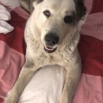Duży biało szary pies z szarą latka na lewym oku o imieni Afina