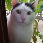 Młody kocurek w kwietniu skończy rok ma biały pyszczek i czarne plamy na oczach i uszach łapki białe grzbiet z ogon czarny. Jest plochliwy i mało ufny
