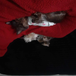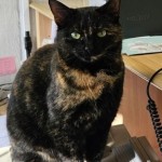 Roczna kotka, bura z białym pyszczkiem/gardłem/brzuchem. Białe skarpetki. Nieufna wobec obcych/strachliwa.