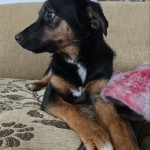 Mała sunia, szczenie. W kolorze tricolor, najwięcej koloru białego i brązowego. Uciekła przez przeciśnięcie się przez bramę schroniska.