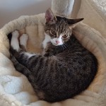 Duży kocurek, puszysty, białe skarpetki na łapkach, umaszczenie białe z pręgami wpadającymi w kolor brązowy, puszysty, oczy niebieskie, łagodny, spokojny, strachliwy.