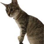 umaszczenie brudno białe a gdzieniegdzie szarawe/czarne, szare/czarne paski na ogonie, reaguje na imię, ma zeza