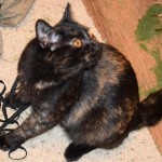 kotka ma rok, szylkretka z ciemnym umaszczeniem: czarno-rude, oczy złoto-miedziane, świecą w nocy na czerwono, złamany ogon w dwóch miejscach, jest raczej okrągła w kształcie, ma jeden biały włos w prawym wąsie, łapka, prawa od tyłu i spodu ruda,