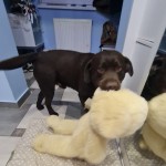 mała,nie sięga nawet do kolan, umaszczenie: przewaga rudego,trochę czarnego i białego. wystające dolne uzębienie. na sobie ma czarna obroże przeciw kleszczom i żółta obroże w króla lwa