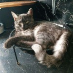 Szaro-popielata kotka, żółtymi oczami, nazywa się Aszoka wiek 2 lata