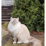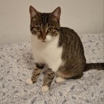 Duży kocurek, puszysty, białe skarpetki na łapkach, umaszczenie białe z pręgami wpadającymi w kolor brązowy, puszysty, oczy niebieskie, łagodny, spokojny, strachliwy.