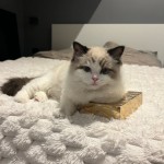 Kotek jest malutki ma 4 miesiące niebieskie oczy jest biało-kremowy i ma ciemne uszy i ogon oraz ciemniejszą plamkę przy oku