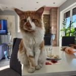 Duży kocur rasy Maine Coon o umaszczeniu rudo-białym z charakterystyczną rudą plamą na białym futerku w okolicach noska i rudymi pędzelkami na uszach. Zubi jest ufny i miziasty.