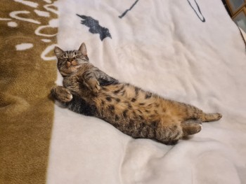 2 letni kocurek. Wysterylizowany i zaczipowany. Bury, pręgowany. Biała plamka na podgardlu i małe białe plamki na 3 łapach. Nieufny wobec obcych