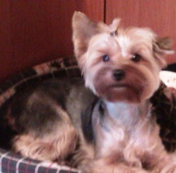 Suczka koloru: grzbiet ciemny, brzuch jasny, złamane (oklapłe) lewe ucho