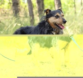 terier mieszaniec mały, 10 kg, czarny podpalany, ma na szyi biało czerwoną obroże, sierść porośnięta dłuższymi popielatymi włosami