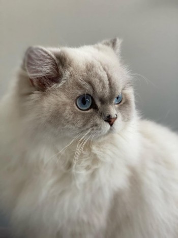 Biały z szarymi uszkami, pyszczkiem, ogonem i stópkami. W TRAKCIE LECZENIA, ledwo się porusza.