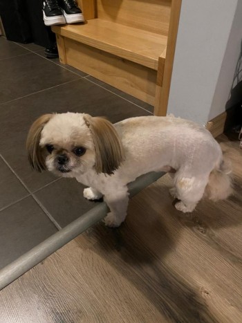 miniaturka shih tzu bardzo mały waga około 3kg , biało beżowy krótko ostrzyżony , dłuższe włosy na ogonie i łapach. Bardzo ufny.