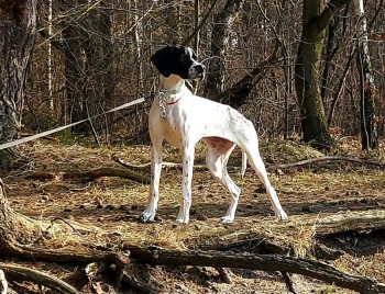 Szczeniak- 11 miesięcy. Biała w czarne kropki, czarny pyszczek. Bardzo wesoła i kontaktowa, nie boi się obcych osób, lgnie do dzieci.
