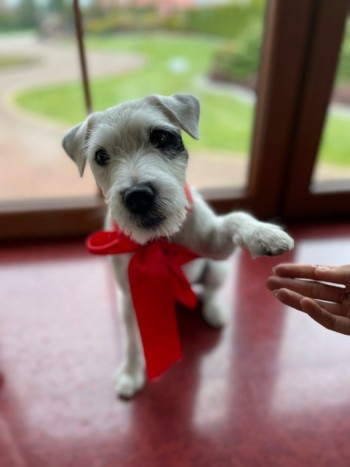 Mały biały piesek z czarną łatką na oku.