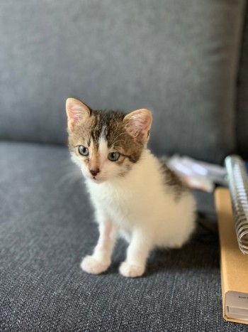 Młoda kotka: biały brzuszek, na plecach ciemnoszare miejscami futerko. Często biega bokiem :)