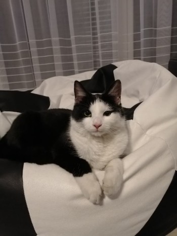 Kot w wieku ok 1,5 roku, czarno-biały rasy mieszaniec. Nazywa się Zeus i reaguję na swoje imię. Znak charakterystyvzny niewidoczny ale jak się pogłaszcze po ogonie czuć na końcu ogona zakrzywienie.