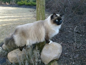 Nasza kotka wabi się Mokka. Ma niebieskie oczy, ciemny pyszczek łapki i ogon. Reszta długiego futra jest kremowo brązowa.
