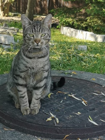 Niebieska obroża z odblaskiem. Na niej numer telefonu i imię.