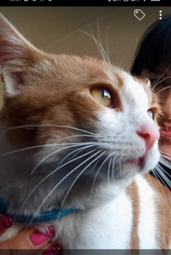 biało-pomarańczowy kot, oswojony, nazywa się Lex, miał czarną obrożę z dzwonkiem