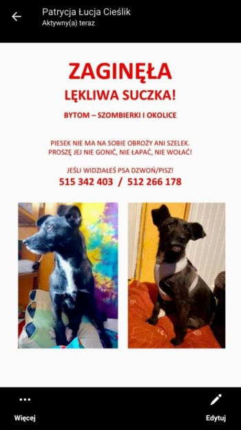 Czarna niewielka suczka z białym krawacikiem. Zaginēła 16 styczen. Jest bardzo lękowa, świezo po adopcji, nie zna terenu. Zlękła sie klaksonu auta i wyrwala z obroży. Widziana tez w Rudzie Śląskiej. Jak widzisz od razu dzwon. Dojedziemy szybko.Nie goń je