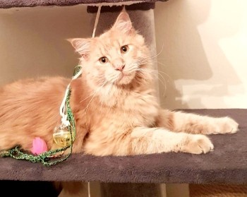 Amigo to duży maine coon w kolorze biszkoptowym. Płochliwy i stroniący od osób, których nie zna. Posiada charakterystyczną kuleczkę na końcówce ogona.