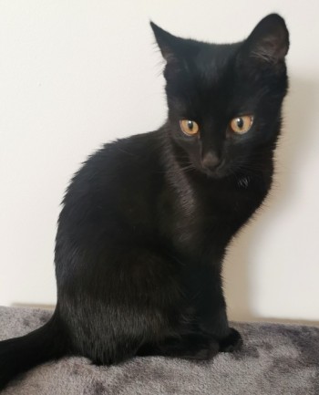 Młody, niewielki kot, ciemnobrązowy z niewielkim białym krawatem na szyjce. Reaguje na imię Brownie (Brauni) i na cmokanie.