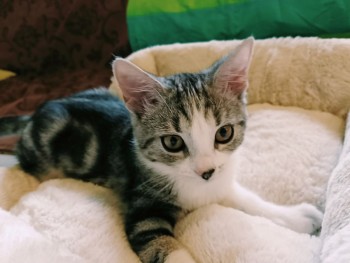 Danielek - roczny kocurek, szaro-biały, na bokach charakterystyczny wzór kółka na ciemnym tle.