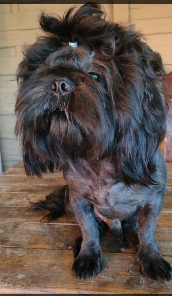 Pies o maści czarnej z brązowym krawatem, krótko przycięty, jak na rase Shih Tzu dość zbudowany i masywny.