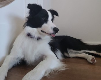 Półtoraroczna suczka Border Collie. Umaszczenie biało czarne - klasyczne. Miała fioletową obrożę. Obojętna na inne psy. Przyjazna i ufna wobec ludzi.