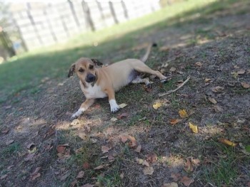 siedmiomiesięczna brązowa sunia z białymi dodatkami.