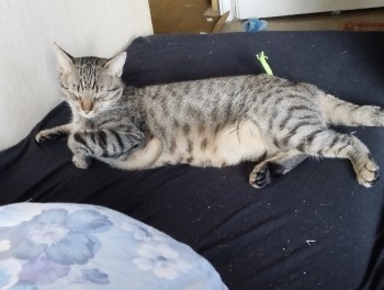 Kitek na futrze ma bardziej kropki niż paski czarne, końcówka jego ogona jest ciemniejsza względem jego ciała. Żeby go do siebie przekonać trzeba zaszeleścić saszetką mokrej karmy. Kitek trochę waży niż powinien i lubi dużo spać. Kitek jest po kastracji i ma chipa na grzbiecie między łopatkami.
