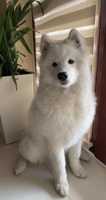 Łagodny pies. Duży, biały, z dużą ilością sierści. Puchaty. Pies rasy samojed