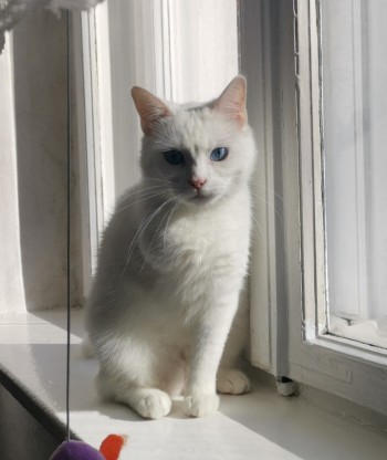 Biała płochliwa kotka. Wydostała się przez ogrodzenie. Bardzo proszę o kontakt
