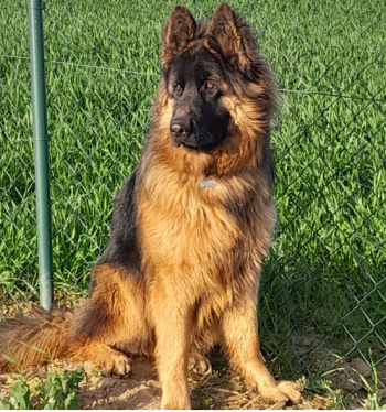 Owczarek niemiecki , czarny podpalany, długowłosy z brązową obrożą