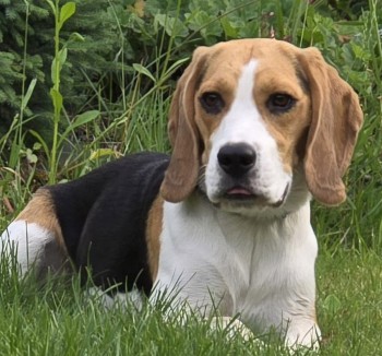 Pies rasy beagle. Dwie geometryczne laty na grzbiecie. Na karku czarna lata okrągła. Oczy z ciemną obwódką. 15 kg. Długie zaokrąglone uszy w kolorze płowym
