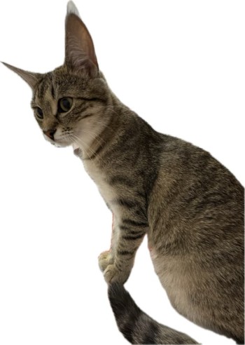 Kotka o maści szaro brązowej, młoda na brzuszku jeszcze nie odrosła sierść po sterylizacji