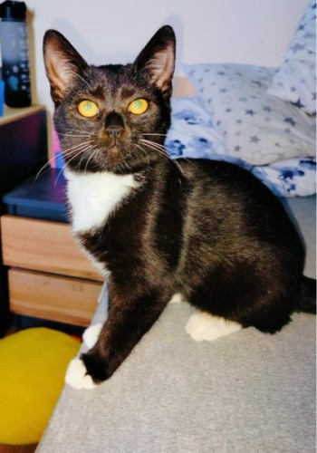 Czarno-biała, drobna koteczka. Pod szyją biała krawatka, na łapkach białe „skarpetki” (takie umaszczenie). Punia może być wystraszona