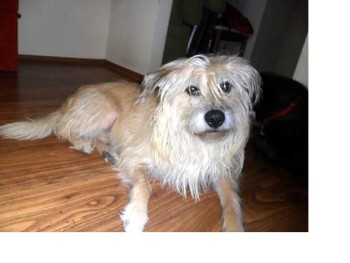 Niewielka ok 10 kg suczka, wielkości do kolana, kundelek, o biszkoptowym umaszczeniu, wabi się Sara