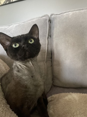 kot rasy devon rex, sierść czarna, krótka. W połowie łysy, krótkie kręcone wąsy. bardzo przyjazny, ufny.