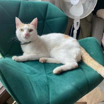 Suzi jest drobna biało-rudą kotką, nosi szara obroże foresto