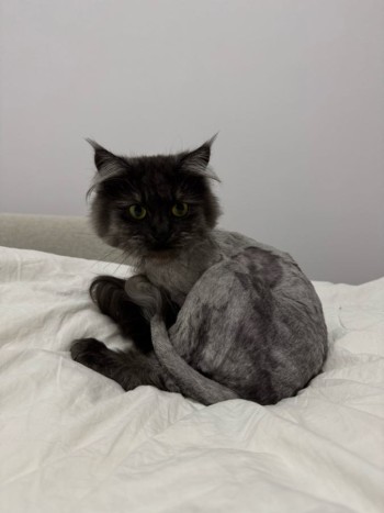 Kot w typie Maine coon, wystrzyżona w charakteryczny sposób, czarna sierść z białym krawatem