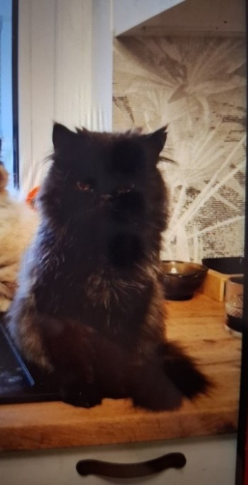 kot Pers czarny , oczy duże pomarańczowe, ostrzyżony.