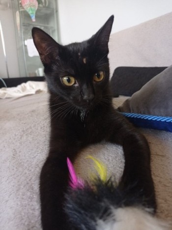 czarna kotka, chuda z malutkim białym krawatem, bardzo ufna