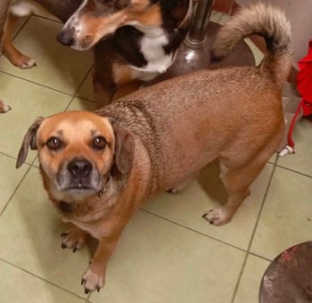 Rudo-brązowy kundelek, krótka sierść, wysokość do kolana, klapnięte uszy, przodozgryz