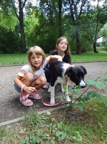 Border collie, czarno biała suka o imieniu Kiwi. Prawdopodobnie w ciąży. Niestety bez obroży. Uciekła z ogrodzonego terenu z kumplem Bodo (karelski pies na niedźwiedzie). Umaszczone jak rodzeństwo.