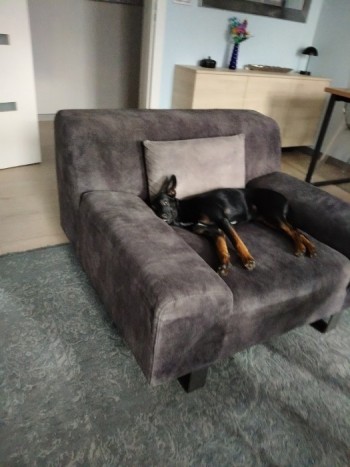 mieszaniec czarny podpalany szczupła ma przyczepioną czarną smycz